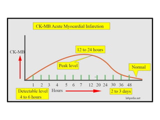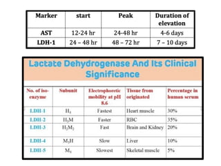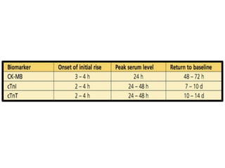 Cardiac markers are biochemical tests used to detect and diagnose cardiac conditions. Common markers include cardiac troponins, CK-MB, myoglobin, and BNP. Cardiac troponins are now the gold standard markers as they are highly specific to the heart and remain elevated for longer than other markers. Newer markers still under study include lipoprotein-associated phospholipase A2 and pregnancy-associated plasma protein A which may help identify unstable coronary plaque. A panel of multiple markers is often used for diagnosis and management of conditions like acute coronary syndrome, myocardial infarction, and congestive heart failure.