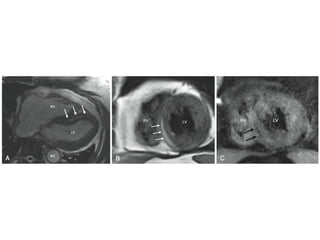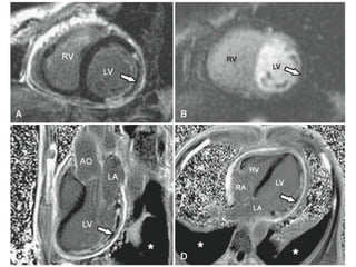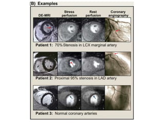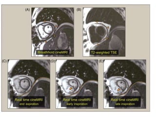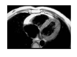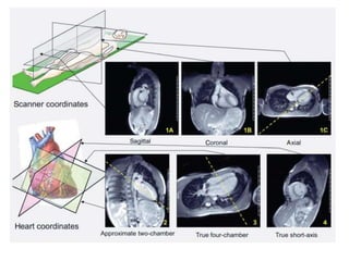 Cardiac MRI has a history dating back to the 1970s when the first MRI machine was developed and techniques for generating images were discovered, leading to the Nobel Prize. MRI uses magnetic fields and radio waves to generate detailed images of the heart and blood vessels without using ionizing radiation. Cardiac MRI is now used clinically to assess cardiac structure and function, detect ischemia and scar tissue, and evaluate various cardiomyopathies.