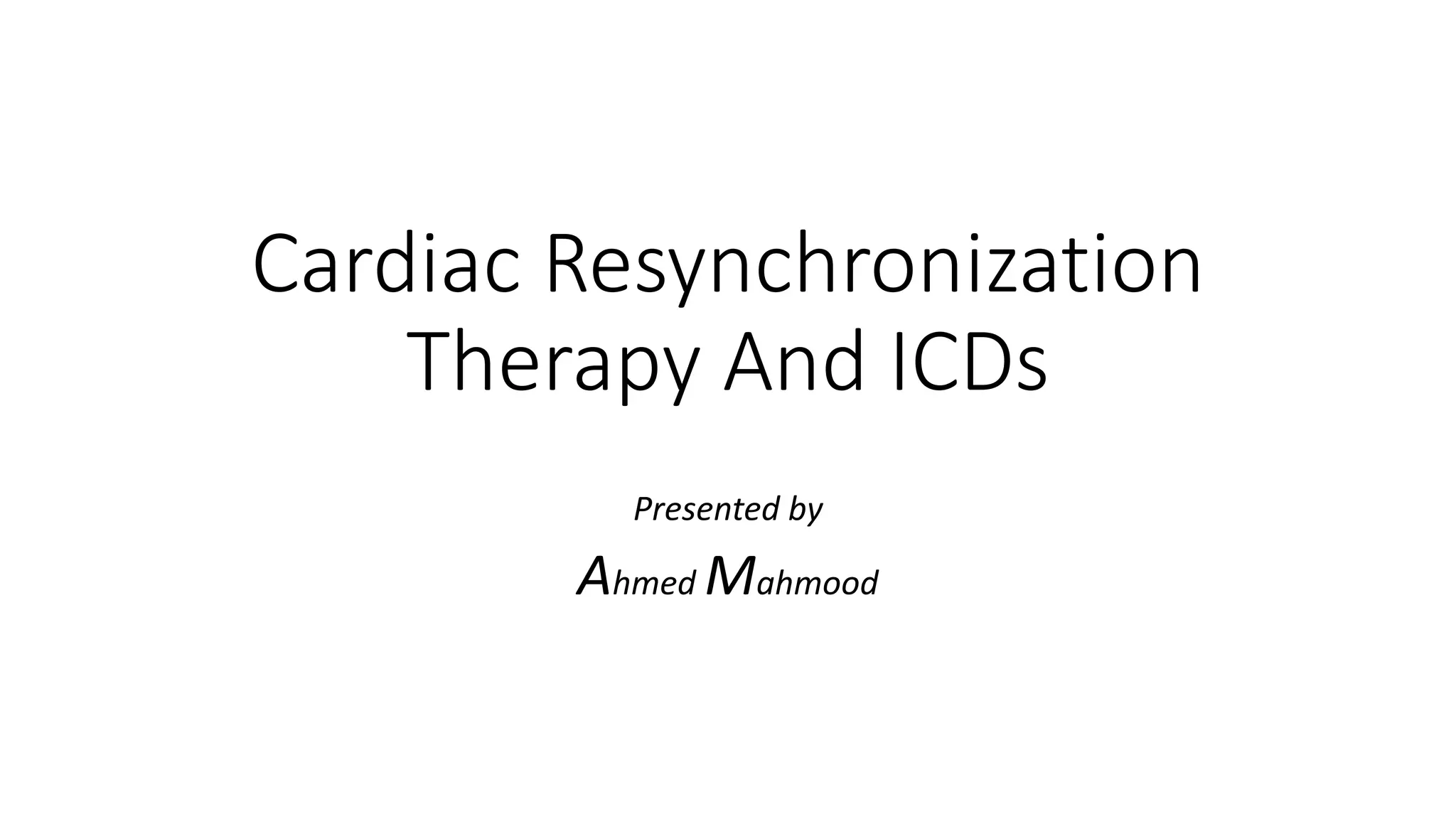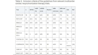 Cardiac resynchronization therapy (CRT) uses an implanted device to resynchronize heart ventricle contractions, improving heart pumping efficiency. CRT-Ds additionally treat abnormal heart rhythms. CRT benefits include improved hemodynamics, reduced heart remodeling, and reduced hospitalizations and mortality. CRT is indicated for patients with left ventricular dysfunction, heart failure symptoms, and prolonged QRS duration, especially over 150ms with left bundle branch block. Randomized trials show CRT effectiveness includes these benefits compared to conventional therapy.