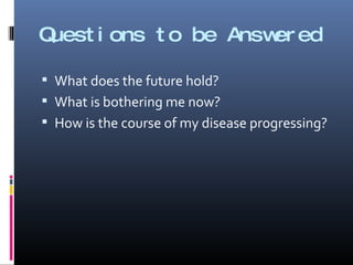 The document discusses various cardiac tests that can be used to answer clinical questions about a patient's condition. It describes tests such as physical exams, echocardiograms, nuclear medicine tests, cardiac CT, and cardiac MRI that provide information on risk factors, existing diseases, signs and symptoms, and the progression of cardiac disease. Examples of specific views and images from these tests are also shown to illustrate what details they can reveal about the heart and blood vessels.