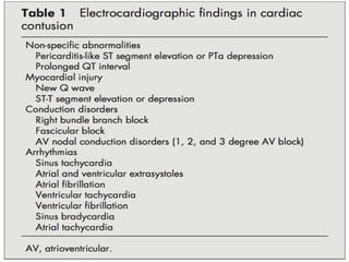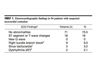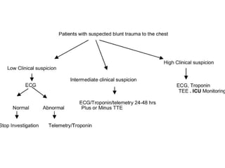 This document provides an overview of cardiac trauma, including both blunt and penetrating trauma. It discusses the history of cardiac surgery and treatments. For blunt cardiac trauma, it covers injury patterns, roles of ECG, cardiac enzymes, radiology, and clinical management. Penetrating cardiac trauma has higher mortality than blunt trauma. Prehospital considerations are to scoop and run the patient. The document advises when emergency department thoracotomy may be indicated for resuscitation of penetrating trauma. It concludes with reminding readers to maintain a high suspicion for cardiac trauma.
