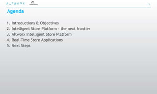 The document discusses an intelligent store platform called Altworx. It describes how Altworx integrates data from various store systems and sensors in real-time to provide operational intelligence. This allows Altworx to detect situations as they occur and recommend actions to the appropriate personnel. Examples are given of applications that could optimize checkout zones, track customer behavior, manage fitting rooms, and monitor energy usage and security. The platform aims to improve sales, costs, compliance and customer experience through proactive recommendations based on combining real-time store data.