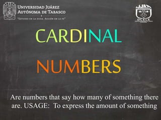 This document defines cardinal numbers as numbers that indicate quantity and provides examples of writing out cardinal numbers from zero to one hundred as words in English. It includes practice examples of writing out numbers forty-five, eighty-six, thirty-one, and fifty as words and homework to say numbers found on license plates, phone numbers, and ask others about their favorite number.