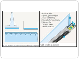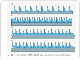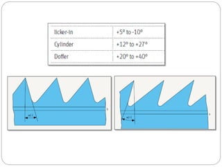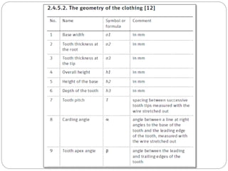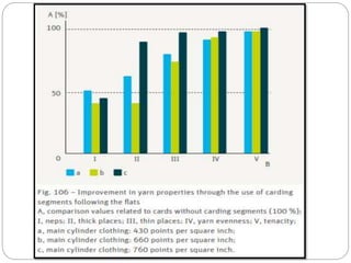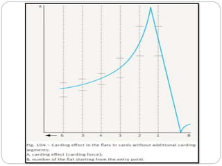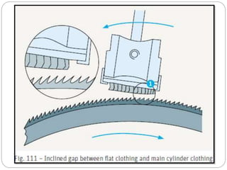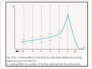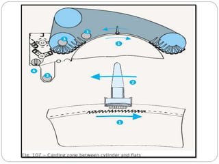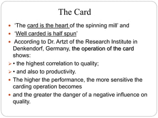 The document discusses the operation of the carding machine, which is considered the "heart" of the spinning mill. It describes the key tasks of the carding machine, including opening fibers into individual strands, removing impurities, disentangling neps, and forming sliver for further processing. The operating principle is explained, with details provided on the material feed, licker-in, main cylinder, flats, doffer, and sliver formation processes. Different carding machine designs are also summarized, such as variations in the card chute and feed device configurations.