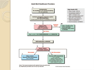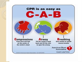 Cardiopulmonary resuscitation (CPR) is a lifesaving technique used in emergencies when someone's breathing or heartbeat has stopped, such as after a heart attack or drowning. The process involves a specified sequence of airway management, chest compressions, and rescue breaths to restore circulation and breathing. CPR techniques vary for adults, children, and infants, with each category having specific steps and considerations to ensure effective resuscitation.