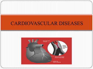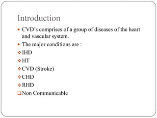 Cardiovascular diseases (CVDs) are a group of conditions that affect the heart and blood vessels. The major CVDs are ischemic heart disease, hypertension, stroke, congenital heart disease, and rheumatic heart disease. Worldwide, CVDs are the leading cause of deaths, responsible for over 30 million deaths annually. In India, the prevalence of coronary heart disease is higher in urban versus rural areas. Some key risk factors for CVDs include age, family history, smoking, high blood pressure, high cholesterol, diabetes, and physical inactivity. Prevention strategies target populations through risk factor modification as well as high-risk individuals through screening and management. The WHO has implemented projects like MONICA to study CVD trends and determin