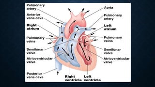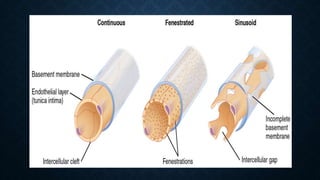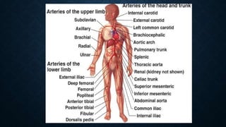 The cardiovascular system transports nutrients and removes waste through the circulatory network. It consists of the heart, blood vessels, and blood. The heart pumps blood through arteries, capillaries, and veins. Arteries carry oxygenated blood away from the heart while veins carry deoxygenated blood back to the heart. Blood vessels have different structures depending on their size and location in the body. The cardiovascular system enables gas exchange, nutrient delivery, and waste removal to sustain life.
