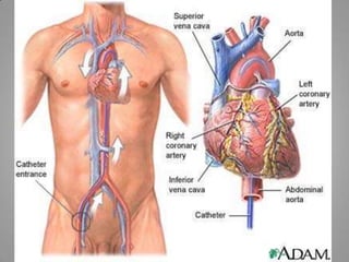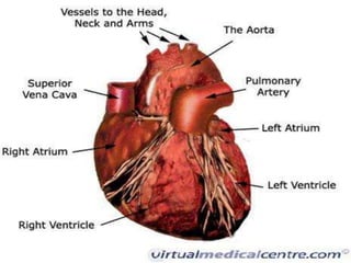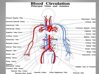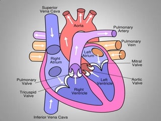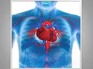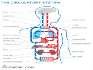 The circulatory system is made up of the heart, blood, and blood vessels. The heart pumps oxygen-rich blood throughout the body via the arteries and returns oxygen-depleted blood to the lungs and heart via the veins. Some key facts about the cardiovascular system are that the adult heart pumps nearly 4,000 gallons of blood per day and beats about 30 million times per year. Common medical tests used to diagnose heart conditions include exercise stress tests, Holter monitors, electrocardiograms, and cardiac catheterizations. Major cardiovascular diseases include atherosclerosis, coronary artery disease, hypertension, and stroke. Preventing cardiovascular disease involves controlling risk factors like smoking, high blood pressure, high cholesterol, lack of physical activity, and obesity.