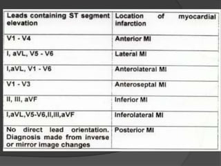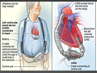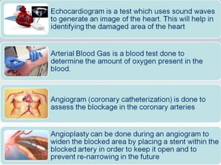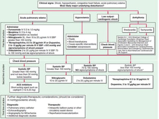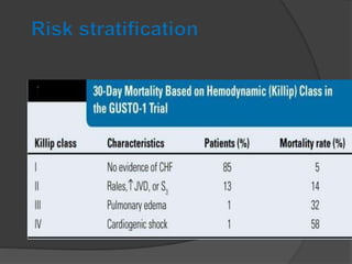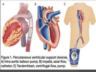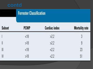 Cardiogenic shock is defined as inadequate tissue perfusion due to cardiac dysfunction or hypo-perfusion of end organs due to cardiac failure. It has a high mortality rate of 50-80% and is most commonly caused by extensive acute myocardial infarction. Symptoms include cyanosis, decreased consciousness, and low blood pressure. Diagnosis involves identifying hypotension, low cardiac index, and signs of hypoperfusion on physical exam along with supportive tests like EKG, echocardiogram, and Swan-Ganz catheter. Treatment focuses on optimizing prefusion with vasopressors or inotropes, diuretics, emergent revascularization through cardiac catheterization, and mechanical circulatory support like IABP,