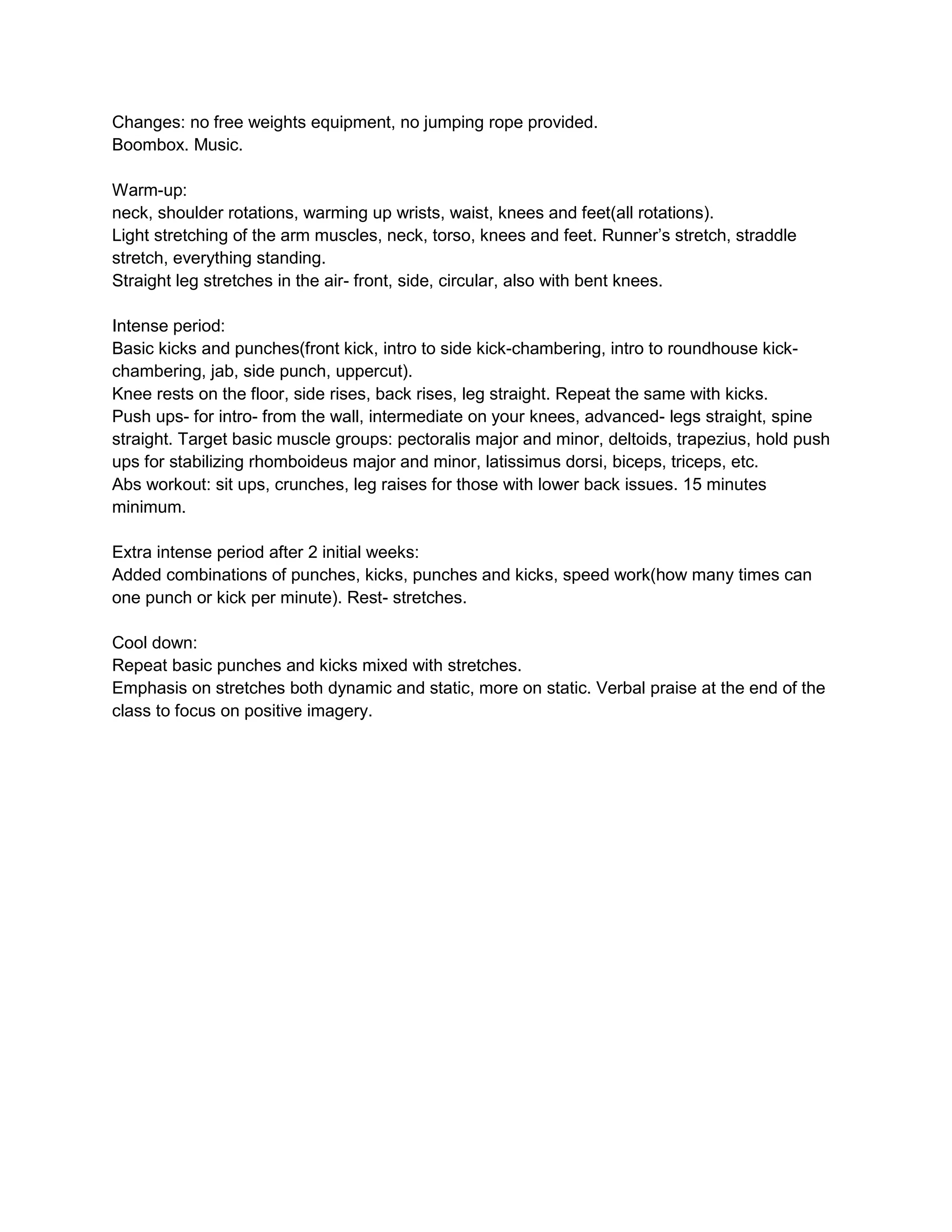 Changes were made to the equipment available, including no free weights or jumping rope. The warm-up included neck, shoulder, wrist, waist, knee, and foot rotations as well as light stretching of the arm, neck, torso, knee, and foot muscles. The intense period consisted of basic kicks, punches, and introductory side kicks and roundhouse kicks followed by pushups, knee rises, back rises, and leg kicks to work the major muscle groups. The abs workout included situps, crunches, and leg raises for 15 minutes. After two weeks, combinations of punches and kicks were added along with speed work to see repetitions per minute, with rests and stretches between. The cool down repeated basic pun