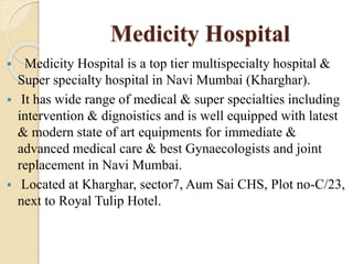 Medicity Hospital is a premier multispecialty hospital located in Kharghar, Navi Mumbai, offering advanced medical care across various specialties, including cardiology and gynecology. The document also details specific heart-related disorders, types of hyperlipidemia, and conditions like pericarditis and cardiomyopathy, highlighting the clinical management and diagnostic features relevant to each condition. The hospital is equipped with modern facilities and emphasizes immediate and advanced care for patients.