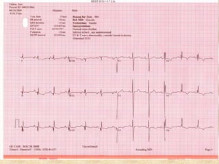 This document presents a cardiology case of a 56-year-old Hispanic male with a history of heart failure, ischemic cardiomyopathy, myocardial infarctions, hypertension, and strokes who was transferred for outpatient IV antibiotics and cardiology consultation. The patient's medical history, medications, physical exam findings, assessments, and treatment plans are summarized. Discussion topics include the patient's heart failure stage, electrocardiogram and chest x-ray findings, and automatic implantable cardioverter-defibrillator.
