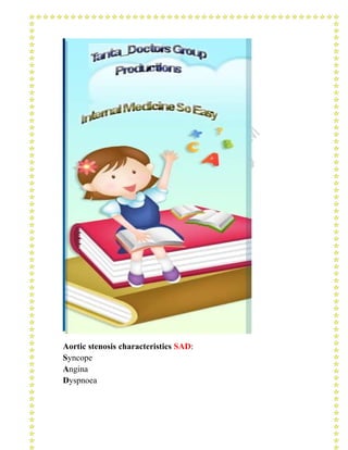 This document contains mnemonics and summaries to aid in remembering various concepts in cardiology. It includes summaries of aortic stenosis characteristics, management of myocardial infarction, causes of pericarditis, heart compensatory mechanisms, distinguishing right and left heart murmurs, causes of ST elevation on ECG, Beck's triad signs, and treatment for myocardial infarction. It also includes mnemonics for jugular venous pressure causes, depressed ST-segment causes, innocent murmur features, murmur locations, cardioselective betablockers, and more.