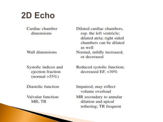 1) The causes, symptoms, signs, diagnostic tests and goals of treatment for DCM. The mainstay of therapy includes vasodilators, digoxin and diuretics.