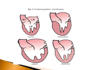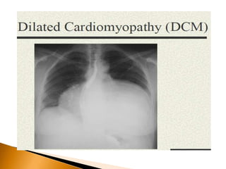 This document discusses dilated cardiomyopathy (DCM), the most common type of cardiomyopathy. It provides details on: