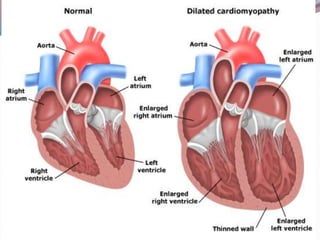 - Restrictive cardiomyopathy causes stiff ventricles and impaired ventricular filling due to disorders like amyloidosis. It presents with symptoms of right and left heart failure.