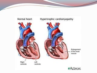 - Hypertrophic cardiomyopathy involves abnormal thickening of the heart muscle and can lead to outflow obstruction. It is a common cause of sudden death in young athletes.