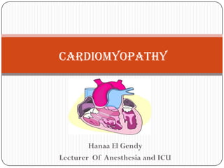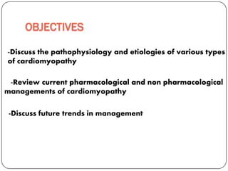 This document discusses various types of cardiomyopathy, including dilated cardiomyopathy, hypertrophic cardiomyopathy, restrictive cardiomyopathy, and Takotsubo cardiomyopathy. It covers the pathophysiology, clinical presentation, diagnosis, and management of each type. It also discusses prognosis and the use of stem cells in treating cardiomyopathy.