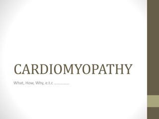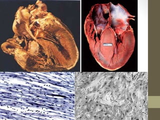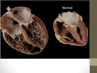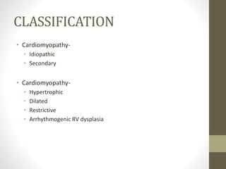 This document provides an overview of different types of cardiomyopathy including hypertrophic cardiomyopathy (HCM), dilated cardiomyopathy (DCM), restrictive cardiomyopathy (RCM), and arrhythmogenic right ventricular dysplasia (ARVD). It describes the pathology, diagnosis, and management of each type. HCM is characterized by unexplained left ventricular hypertrophy. DCM involves dilated chambers and systolic dysfunction. RCM causes increased myocardial stiffness. ARVD primarily affects the right ventricle with replacement by fibrofatty tissue. The document also briefly discusses left ventricular non-compaction and Takotsubo cardiomyopathy.
