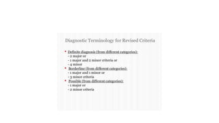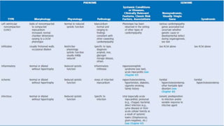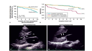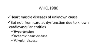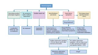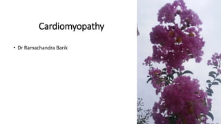 The document discusses various forms of cardiomyopathy, their definitions, classifications, symptoms, and complications. It encompasses types such as dilated, hypertrophic, restrictive, and arrhythmogenic right ventricular dysplasia, detailing pathophysiology, risk factors, diagnostics, and treatment options. Additionally, it covers associated conditions like carcinoid heart disease and long QT syndrome, highlighting the importance of genetic factors and the clinical implications of these heart muscle diseases.