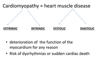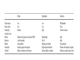 The document covers various aspects of cardiomyopathy and its management in the context of anesthesia, including types such as dilated, hypertrophic, and restrictive cardiomyopathy. It outlines the pathophysiology, causes, and treatment strategies, emphasizing the importance of careful monitoring and management of patients with heart function issues during anesthesia. Additionally, it addresses specific considerations for anesthetic approaches, including the avoidance of certain agents and the maintenance of hemodynamic stability.