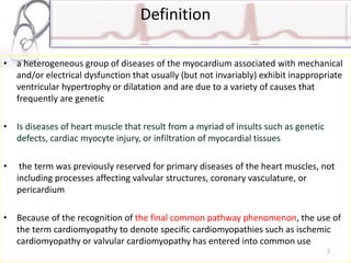 The document provides an overview of cardiomyopathies including definitions, classifications, presentations, evaluations, and treatments. It discusses the main types - dilated cardiomyopathy, hypertrophic cardiomyopathy, and restrictive cardiomyopathy. For dilated cardiomyopathy, it describes the etiologies, clinical features, investigations, and treatments. It notes dilated cardiomyopathy is the most common cardiomyopathic phenotype and often a final common pathway of cardiac injuries. For hypertrophic cardiomyopathy, it discusses the pathophysiology, clinical manifestations, investigations, and treatments including the use of beta-blockers and surgical procedures. For restrictive cardiomyopathy, it lists possible causes and notes the hallmark is abnormal diastolic function with excessive ventricular wall rig