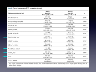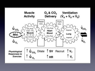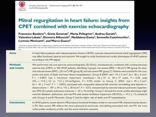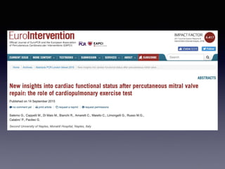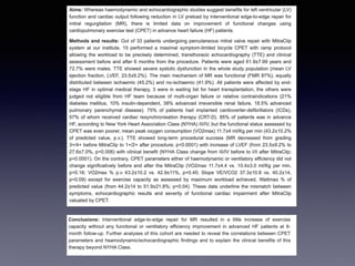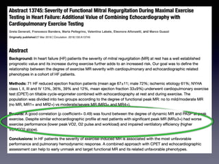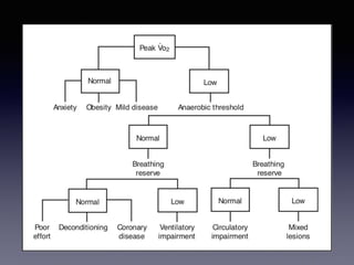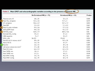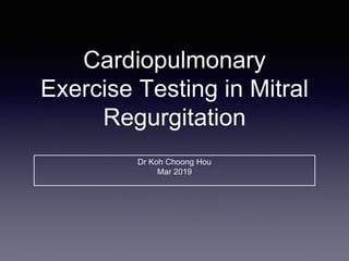 The document discusses the use of cardiopulmonary exercise testing (CPET) in evaluating functional capacity in patients with mitral regurgitation, focusing on various CPET parameters such as VO2 max, O2 pulse, and ventilatory efficiency. It highlights correlations between exercise performance and mitral regurgitation severity, noting that impaired ventilatory efficiency is significant in patients with severe conditions. The study emphasizes the importance of rehabilitation in managing these patients.