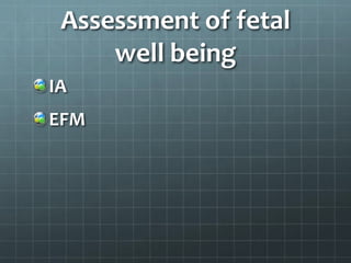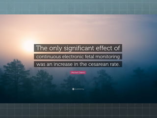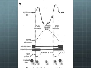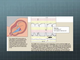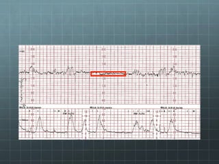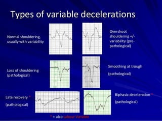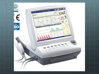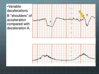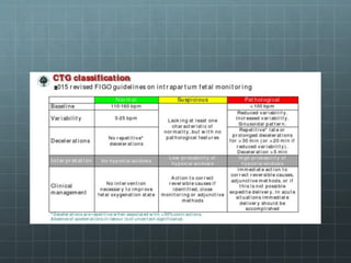 This document provides guidance on cardiotocography (CTG), which assesses fetal well-being by monitoring the fetal heart rate and uterine contractions. It outlines the indications for CTG, how to perform and interpret a CTG, management based on CTG findings, and conservative measures that can be tried to improve abnormal tracings before expediting delivery. Key aspects of CTG include assessing the baseline heart rate, variability, accelerations, decelerations, and developing an overall impression of normal, suspicious, or pathological to guide management decisions.