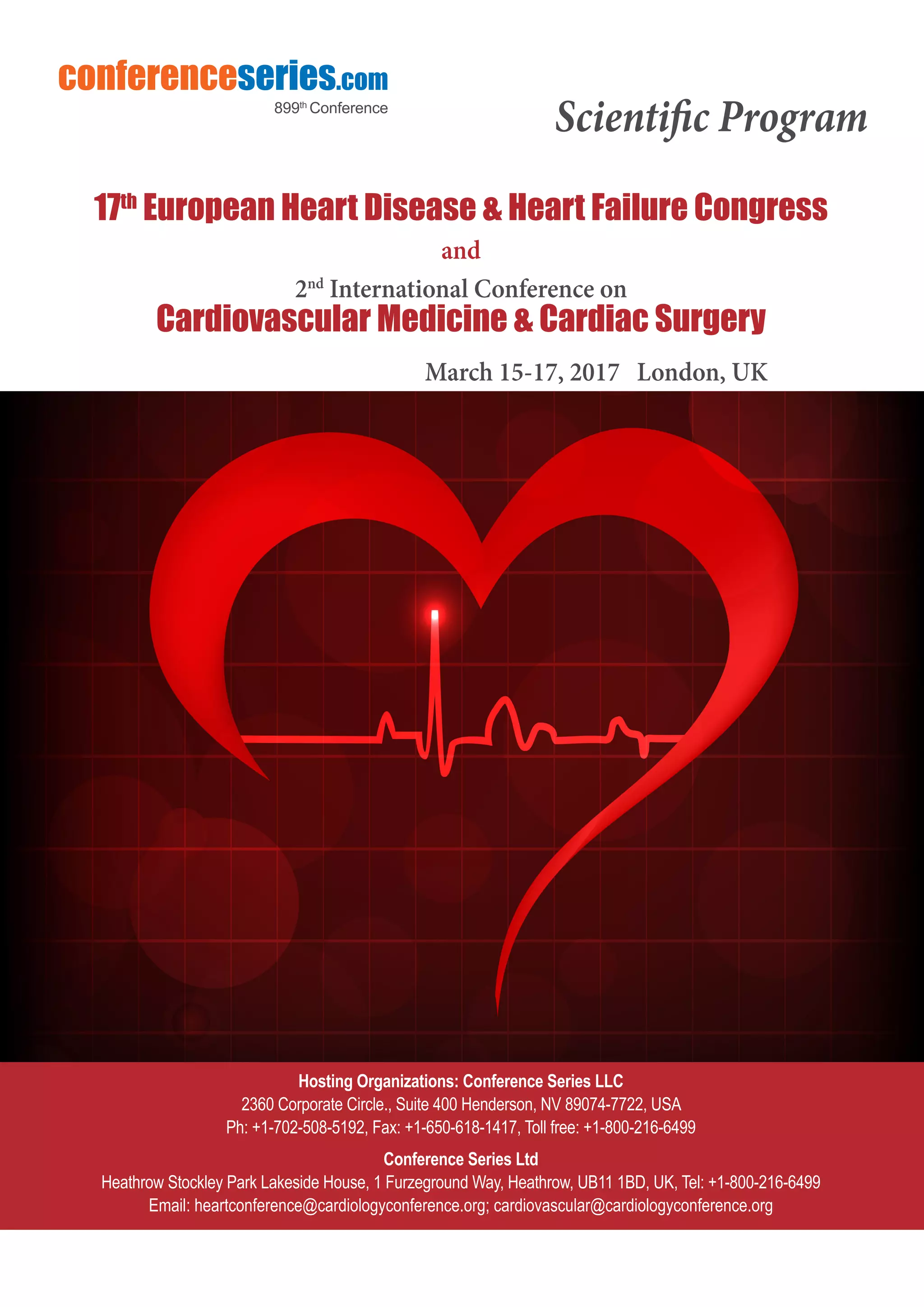 The document outlines the 17th European Heart Disease & Heart Failure Congress and the 2nd International Conference on Cardiovascular Medicine & Cardiac Surgery held in London from March 15-17, 2017. It details the event's scientific program, session topics, speakers, and presentations focused on various aspects of cardiology, heart disease, and treatments. Networking opportunities and poster presentations are also highlighted throughout the three-day conference.