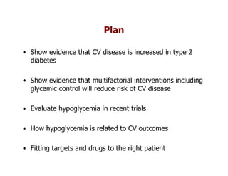 This document discusses evidence that intensive glycemic control can reduce cardiovascular risk for patients with type 2 diabetes, but that this risk reduction may come at the price of increased risk of hypoglycemia. Some key points discussed include: 1) trials like UKPDS and ACCORD showed glycemic control reduced microvascular and cardiovascular complications but increased risk of hypoglycemia; 2) hypoglycemia is associated with increased cardiovascular risk and mortality in some studies; and 3) the benefits of intensive control may depend on patient characteristics like age and diabetes duration, with shorter-duration patients experiencing more benefit. The document evaluates how best to fit treatment targets and medications to individual patients to maximize benefits and minimize hypoglycemia risk.