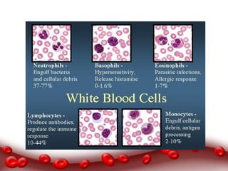 The document discusses the components and functions of blood. Blood has three main functions: transportation, regulation, and protection. Whole blood consists of blood plasma and formed elements, which include red blood cells, white blood cells, and platelets. Red blood cells contain hemoglobin and transport oxygen, white blood cells help fight infection, and platelets form clots to stop bleeding. Blood types are determined by antigens on red blood cells, and Rh disease can occur if an Rh- mother has an Rh+ baby.