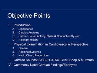 This document provides an outline for a physical examination focused on cardiovascular health. It begins with an introduction on cardiac anatomy, sounds, and conduction. The physical examination section describes inspecting, palpating, and auscultating the skin, head, neck, chest, abdomen, and extremities. Vital signs and common findings are also reviewed, including assessing jugular venous distention and lymph nodes in the neck. Key cardiac sounds and murmurs are defined. References include textbooks on internal medicine, physical examination, and cardiology.