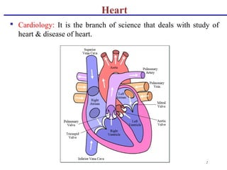 The document provides information on the cardiovascular system and heart anatomy. It discusses the heart chambers, which include the right and left atria and ventricles. It also describes the major blood vessels associated with the heart and the pathway of blood flow from the heart to the lungs and throughout the body. Additionally, it covers the layers of the heart wall, heart valves that prevent backflow of blood, and the conducting system which coordinates heart contractions.