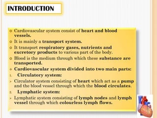 The cardiovascular system comprises the heart and blood vessels, functioning primarily as a transport system for gases, nutrients, and waste. The heart, a muscular organ, has four chambers (two atria and two ventricles) and is surrounded by three tissue layers, ensuring unidirectional blood flow through valves while facilitating both pulmonary and systemic circulation. Key concepts include the cardiac cycle, heart sounds, ECG recordings, and potential disorders affecting heart rate and blood pressure.