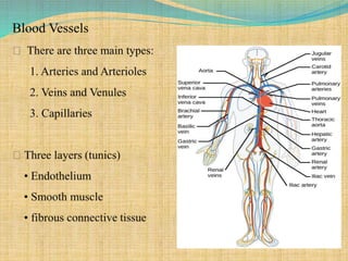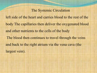 This document summarizes the main components of the cardiovascular system, including the heart, blood vessels (arteries, veins, and capillaries), and blood. It describes the heart's location and layers (epicardium, myocardium, endocardium). The heart chambers are the atria and ventricles, separated by septa. The document lists the four heart valves - tricuspid, bicuspid, pulmonic, and aortic - and their locations. It provides a brief overview of the pulmonary and systemic circulations, describing how deoxygenated blood flows from the heart to the lungs to become oxygenated before returning to the heart.
