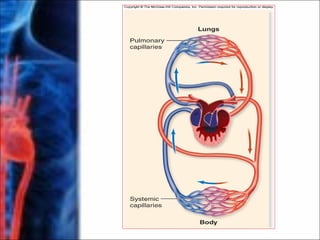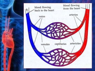 The circulatory system transports nutrients, gases, hormones, cell wastes and more throughout the body. It consists of the heart, blood vessels and blood. The heart pumps blood in a closed system of arteries, capillaries and veins. Arteries carry oxygenated blood away from the heart while veins return deoxygenated blood back to the heart. The evolution of circulatory systems progressed from simple diffusion in single-celled organisms to closed circulatory systems with multiple heart chambers in vertebrates like humans.