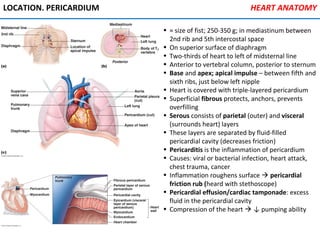 The heart is located in the mediastinum and is protected by the pericardium. It has four chambers - two atria that receive blood and two ventricles that pump blood out. The heart has three layers - the epicardium, myocardium, and endocardium. It is surrounded by the pericardium and has coronary arteries that supply its own blood flow. The heart has four valves that ensure one-way blood flow through the chambers and out to the lungs and body. It is able to contract rhythmically due to pacemaker cells that generate and conduct electrical signals.