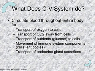 The document summarizes the key components and functioning of the cardiovascular system. It describes the heart structures and chambers, circulation paths through arteries, veins and capillaries, and the roles of valves and vessels in pumping blood throughout the body for gas and nutrient exchange as well as immune system functions. Fetal circulation and remnants in adults are also briefly outlined.