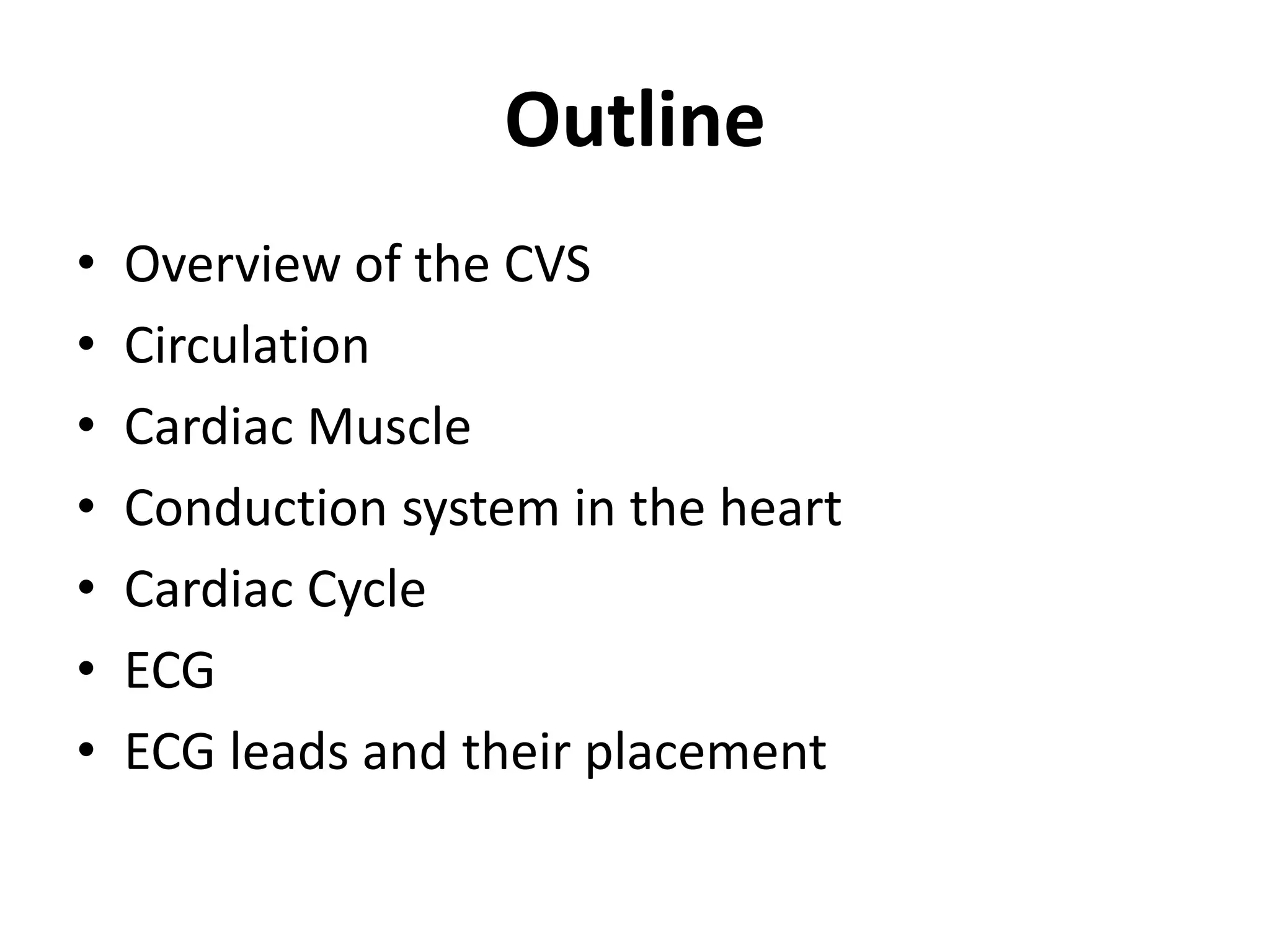 The document provides an overview of the cardiovascular system including the heart, circulation, cardiac muscle contraction, conduction system, cardiac cycle, electrocardiogram (ECG), and ECG leads and placement. Key points include: