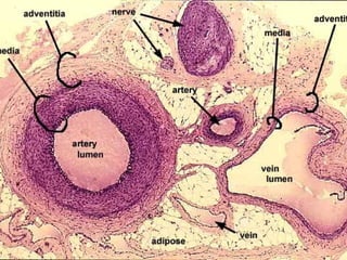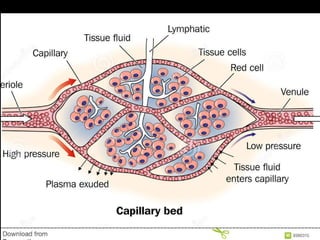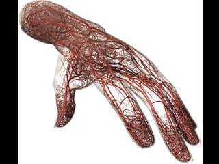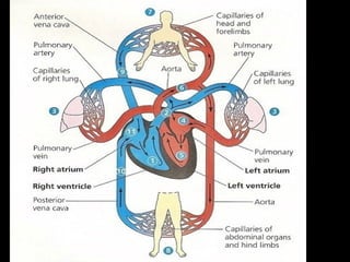 The cardiovascular system consists of the heart, blood vessels, and blood. The heart pumps blood through arteries, which branch into capillaries where oxygen and nutrients are delivered to cells. The deoxygenated blood then returns to the heart through veins. There are two circulation loops - pulmonary circulation between the heart and lungs, and systemic circulation between the heart and the rest of the body. The cardiovascular system functions to transport oxygen, nutrients, hormones, and waste products throughout the body.