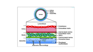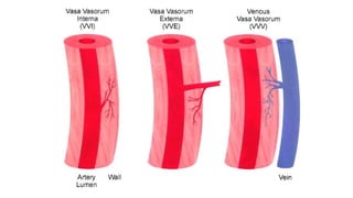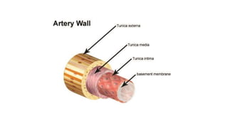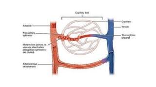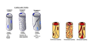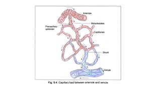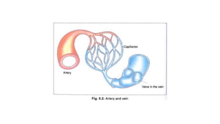 The cardiovascular system consists of the heart, arteries, veins, and capillaries. The heart pumps blood through arteries, which branch into smaller vessels and eventually capillaries where nutrients and waste are exchanged. Capillaries then drain into veins which collect blood and return it to the heart. The cardiovascular system transports blood throughout the body in two circuits - systemic circulation from the heart to the body and pulmonary circulation from the heart to the lungs.