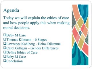 2. It summarizes Carol Gilligan's research challenging Lawrence Kohlberg's theory of moral development, finding that women tend to use a care-based approach while men use justice.