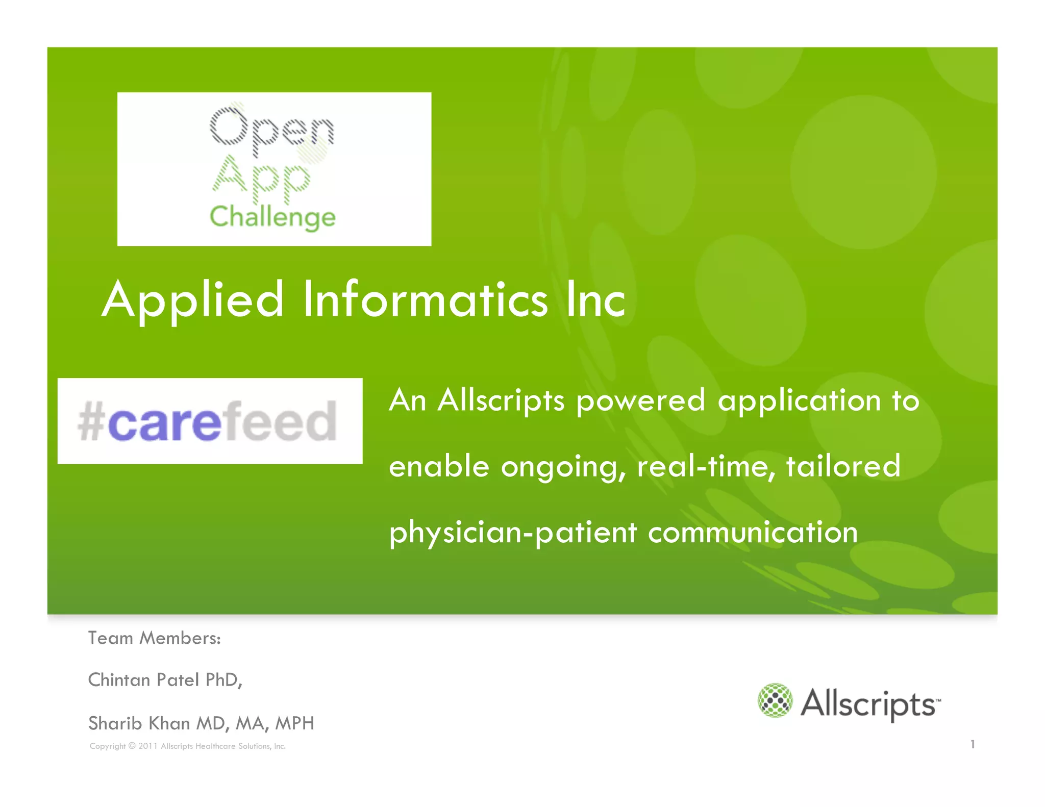 CareFeed is an online communication platform that allows physicians to communicate with patients in real-time through a web and mobile application. It is integrated with the Allscripts EHR system to enable physicians to send targeted messages to patient groups based on their medical records. The platform aims to improve chronic disease management by facilitating ongoing physician-patient communication and engagement.