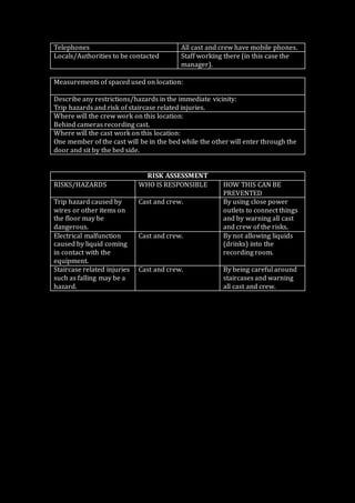 The document provides location details for filming at Seaton Hall Residential Home in Greatham, Hartlepool. The home was chosen as the final destination for the protagonist in the narrative. Cast and crew will access the location primarily by foot or car. Precautions will be taken to minimize disruption to residents, including using battery saving modes. The crew will film behind cameras while one cast member acts in the bed and another enters through the door. Key risks include trip hazards, electrical issues, and staircase injuries, which will be prevented through careful wiring, banning liquids near equipment, and warnings.