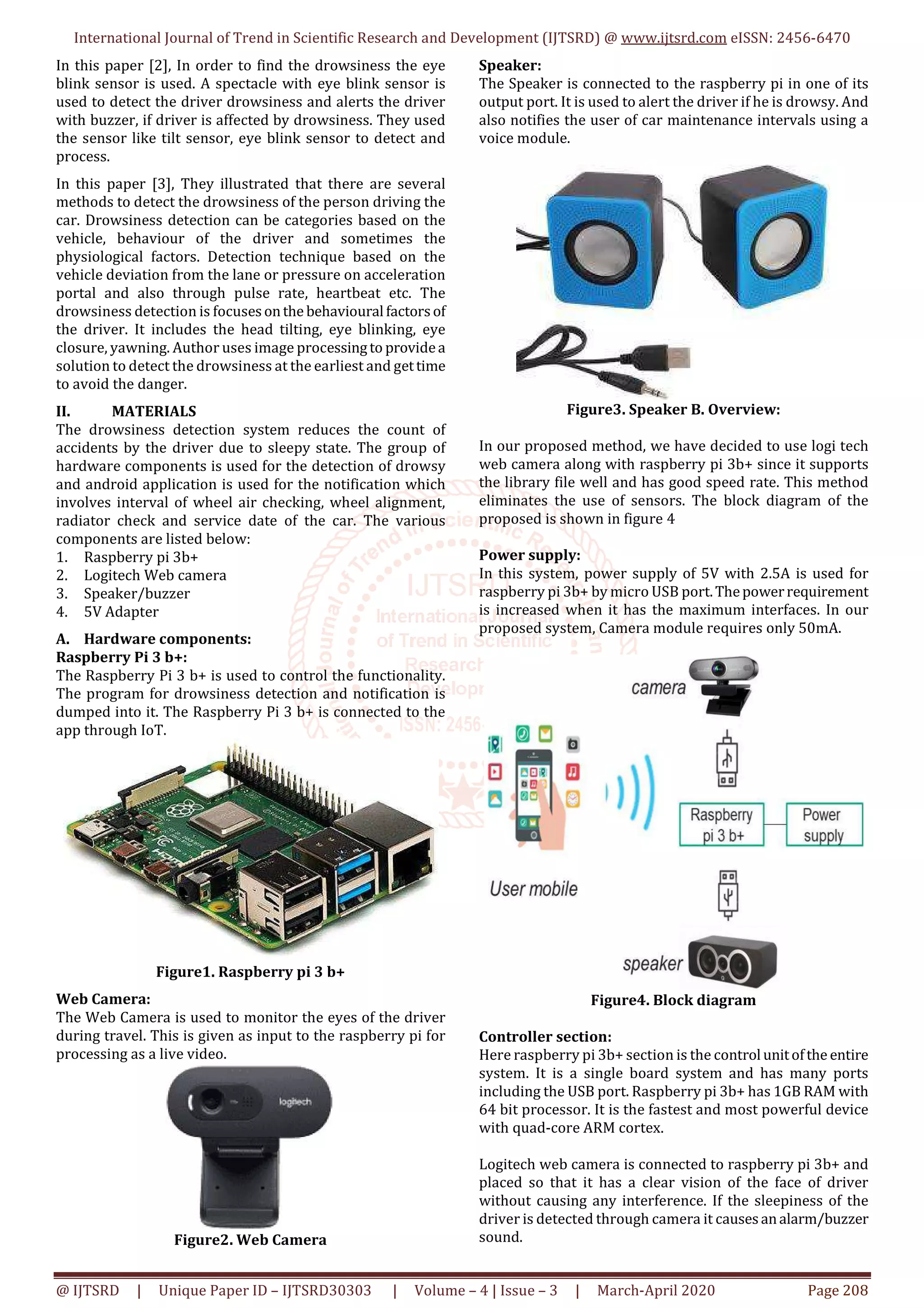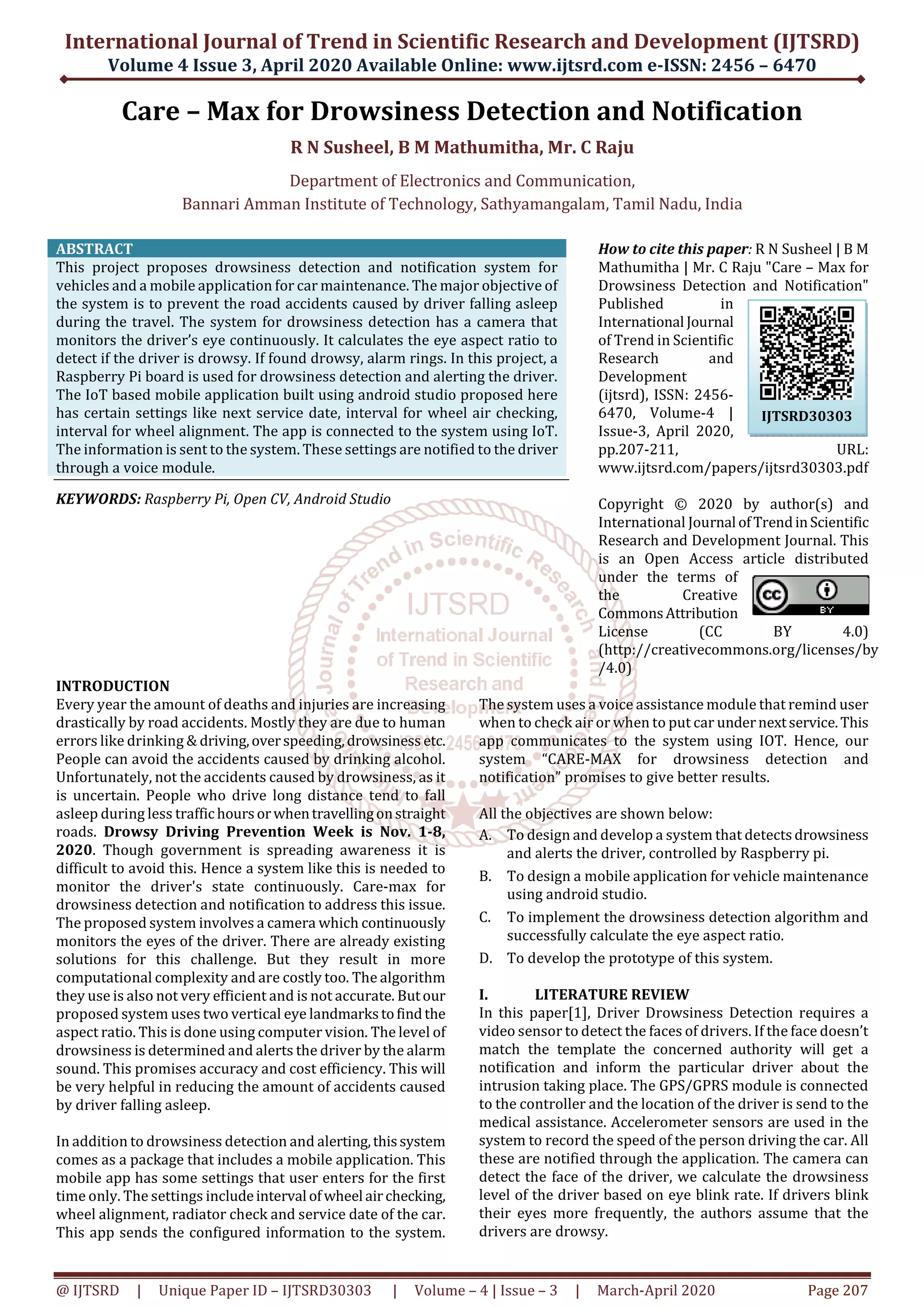 The document presents a project for a drowsiness detection and notification system aimed at preventing road accidents caused by falling asleep while driving. It employs a camera to monitor the driver's eyes, calculates the eye aspect ratio to detect drowsiness, and activates an alarm when detected; additionally, it includes an IoT-based mobile application for vehicle maintenance alerts. The system is powered by a Raspberry Pi and utilizes computer vision technology for accuracy and cost efficiency.