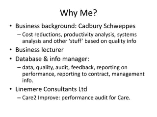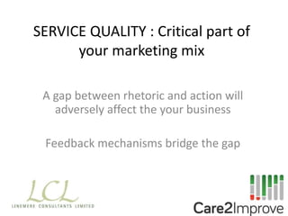 The document emphasizes the importance of service quality in business, particularly in the care sector, highlighting the need for effective feedback mechanisms to bridge gaps between perceived and actual service quality. It outlines various performance indicators and auditing processes to assess and improve service quality, while stressing the significance of stakeholder engagement and continuous improvement. Additionally, it discusses tools and frameworks like the European Excellence model and ISO9001 for measuring and enhancing performance, thereby ensuring that services meet established standards and client expectations.
