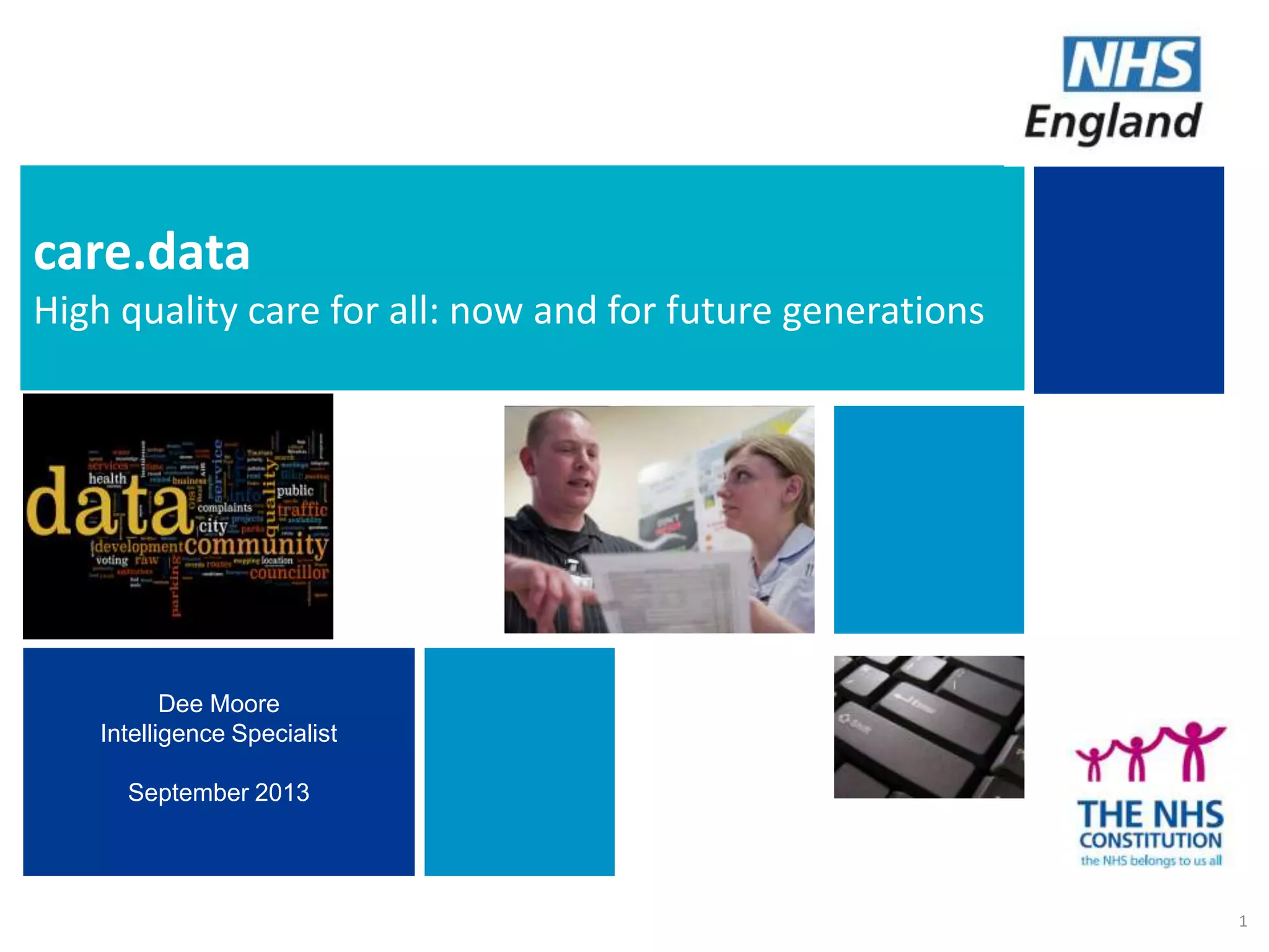 The document summarizes the care.data program in the NHS which aims to improve patient care through better use of data. It will provide comprehensive and timely healthcare data to patients, professionals, providers and researchers. The program will extract primary care data from GP practices with patient consent to join it with other hospital data. It is being rolled out in phases and aims to eventually include social care and community health data. Strict information governance standards are in place to protect patient privacy and data security. The goal is to help identify variations or gaps in care quality, monitor outcomes over time, and support health services research.