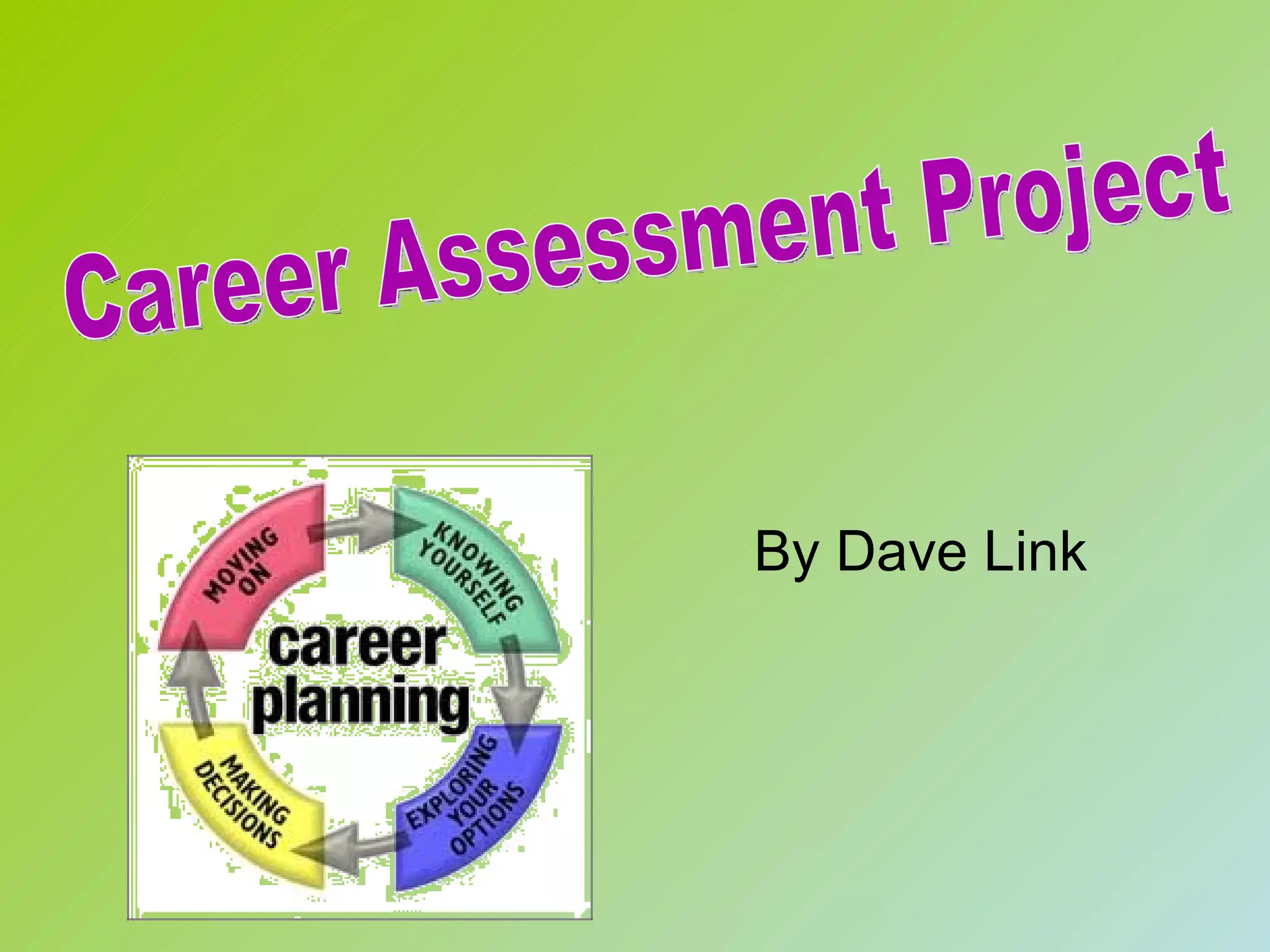 The document provides information about the author, including their lifestyle choices, learning style, work values, unique qualities, and foundation blocks. Their 1, 5, and 10 year goals focus on education, career exploration, and job stability. Testing revealed the author is a visual and tactical learner. Their top work values are potential for promotion, recognition, and independence. The author's Holland Code is C-E-R, suggesting careers like Accountant, Administrative Service Manager, or Nuclear Power Reactor Operator. Assessments uncovered interests in carpentry, detective work, and nuclear engineering. Overall, the career exploration process helped the author consider new potential careers.