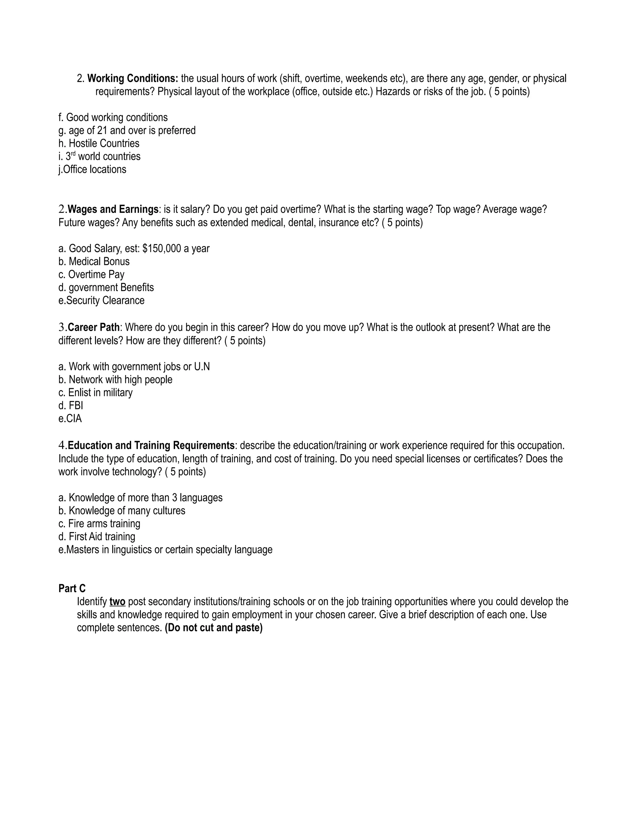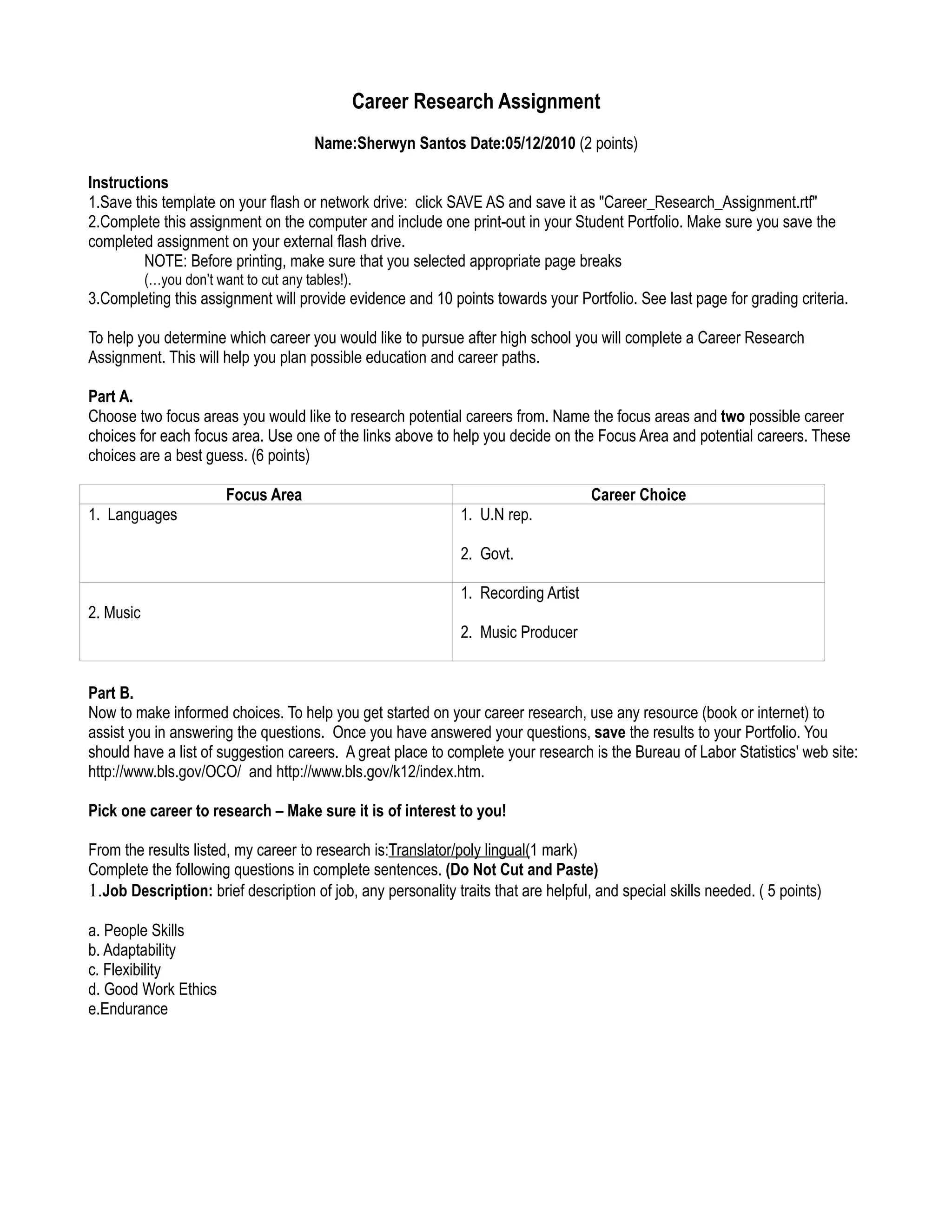 The document provides instructions for a career research assignment where the student must choose two potential career focus areas, research one career in more depth by answering questions about it, and identify relevant coursework, experiences, and contacts to pursue that career. The student researches being a translator/polyglot and reflects on still being interested in that career due to enjoying languages and helping people.