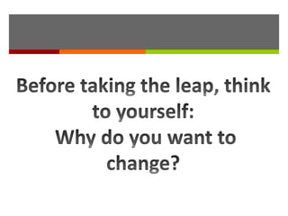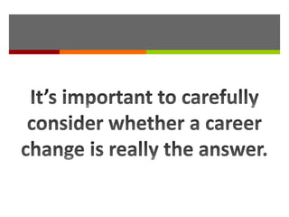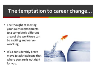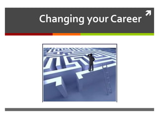 This document discusses considerations for changing careers. It defines a career change as a complete overhaul that will likely require retraining and starting from entry-level positions. It advises assessing one's current skills and determining what is missing to see if a change in hours, colleagues, or work itself could satisfy them before pursuing a career change. If a change is still desired, it recommends exploring options like informational interviews, work experience in the new field, speaking to training providers, and recruiting consultants for guidance on making the transition.